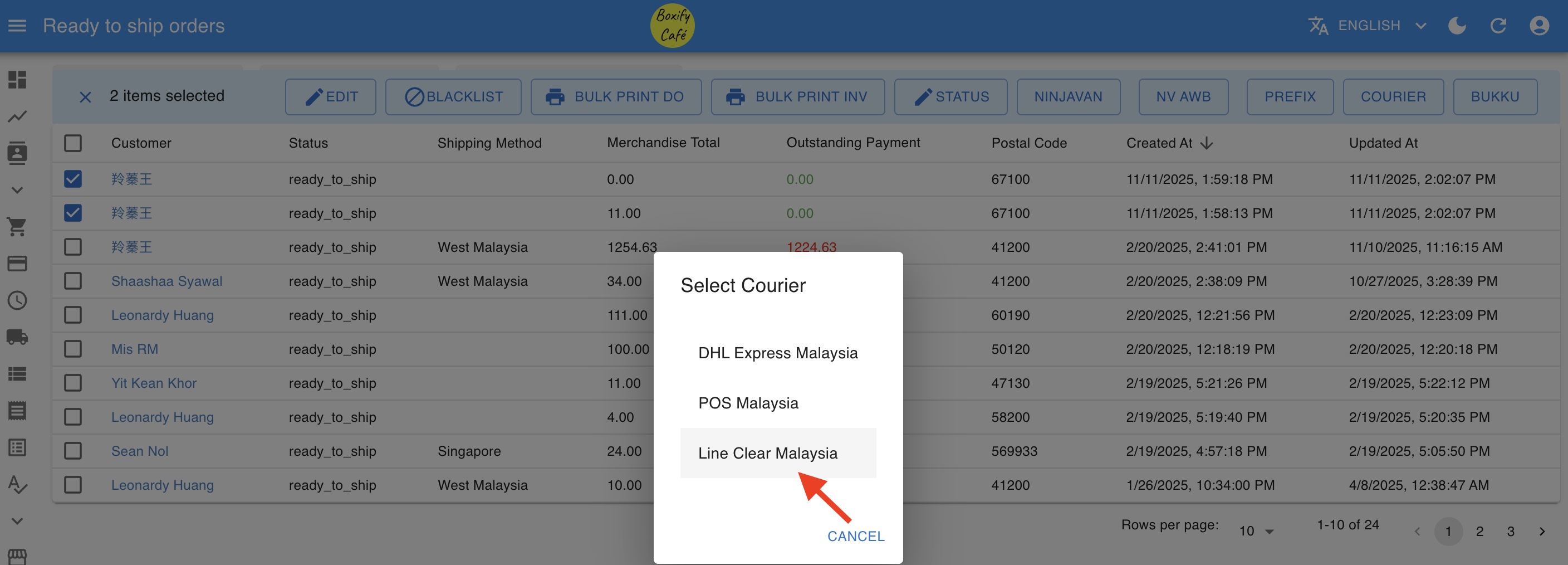 Section titled “Line Clear Malaysia Actions”- Select the orders that you want to send to Line Clear.